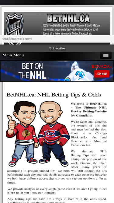 71%Welcome to BetNHL.ca - The Ultimate NHL Hockey Betting Website for Canadians. We're Scott and Graeme, the owners of this site and men behind the tips.