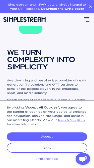We are Simplestream, an award-winning and best-in-class provider of next-generation TV solutions to some of the biggest players in the broadcast, sport, and media industry.