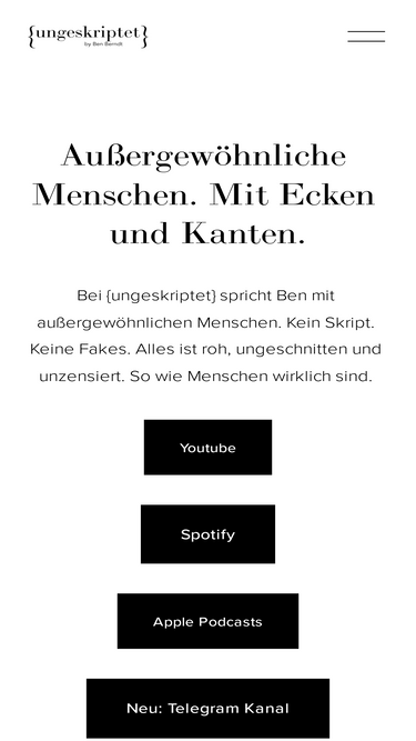 73%Bei {ungeskriptet} spricht Ben mit außergewöhnlichen Menschen. Er führt tiefe, lustige und manchmal traurige Gespräche. Alles ist roh, ungeschnitten und unzensiert. So wie Menschen wirklich sind.