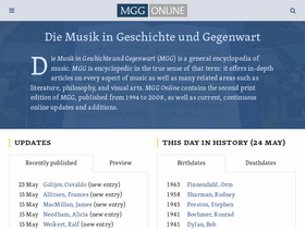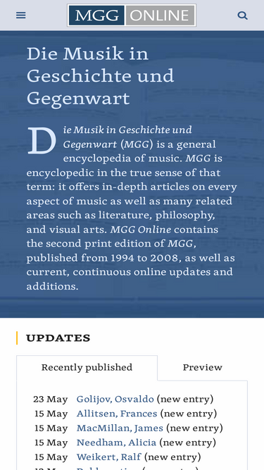 76%Die Musik in Geschichte und Gegenwart (MGG) is a general encyclopedia of music. MGG is encyclopedic in the true sense of that term: it offers in-depth articles on every aspect of music as well as many related areas such as literature, philosophy, and visual arts. MGG Online contains the second print edition of MGG, published from 1994 to 2008, as well as current, continuous online updates and additions.