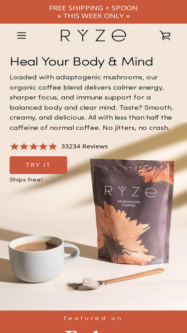 63%Drink RYZE mushroom coffee for better focus, lasting energy, and superb immune support. It contains functional mushrooms and keto-friendly ingredients that help relieve stress and keep you feeling calm. Enjoy anytime, anywhere. Free shipping on all subscription orders.