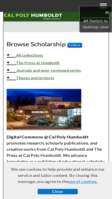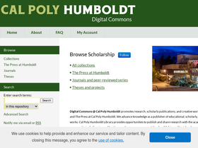 94%digital commons @ cal poly humboldt promotes research, scholarly publications, and creative works from call poly humboldt and the press at cal poly humboldt. we advance knowledge as a publisher of educational, scholarly, trade books, and creative works. cal poly humboldt library provides opportunities to publish and share research with the academic and global community, including: journal hosting, conference management, book publishing, editorial and peer-review tools, and scholar pages.
