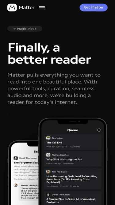 71%Matter brings newsletters, feeds, and read-later into one beautiful interface. It’s the ultimate reading client for the open web.