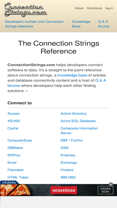 89%all connection strings in one place. find the syntax for your database connection using ado.net, ado, odbc, oledb, c#, vb, vb.net, asp.net and more.