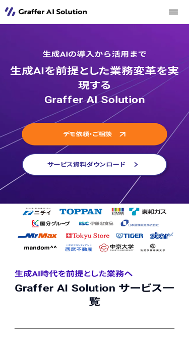 82%初心者からヘビーユーザーまで、日常的に生成AIを活用しやすい機能を搭載した法人向け生成AIプロダクト「Graffer AI Studio」、利活用を推進するための伴走支援や研修・人材育成を通じて、企業における生成AIの導入から活用まで幅広く支援。東証プライム上場企業など多数導入中。業務ごとに特化したアプリ開発を行いAIエージェントをはじめとする様々なソリューションを提供します。