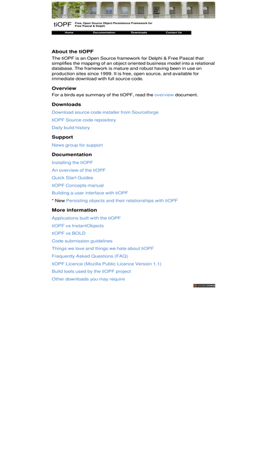 100%tiopf - the free, open source object persistence framework for delphi 7, bds2006 & free pascal. helps you build complex oo applications with data being saved to sqlserver, interbase, oracle, firebird, xml, csv or to a remote database proxy server via http. has been used in large and small projects since 1998. full source code with 1300 unit tests to assure quality. news group for peer support. automatic build each night with all unit tests being run against each persistence layer against delphi & fpc compilers.