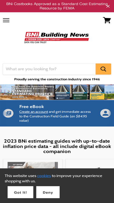 73%For 75 years, BNi Building News has been the nation's leading source for construction cost estimating books, square-foot cost data, building codes, electrical codes, Gypsum Association references, and public works specifications including the Greenbook.