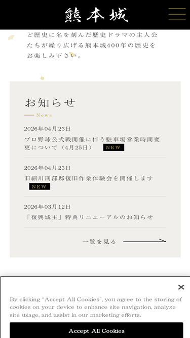 86%今こそ見てほしい熊本城。平成28年熊本地震で大きな被害を受けた熊本城ですが、二の丸広場や加藤神社から、天守閣等を見ることができます。熊本城の復旧状況のお知らせや、二の丸広場等を活用したイベント情報も随時更新しております。熊本城修復の支援を募る「復興城主」制度も情報を掲載しています。