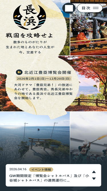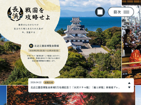 82%豊臣秀吉・秀長兄弟ゆかりの地、滋賀県長浜市を紹介しているホームページです。大河ドラマ館のご案内と、長浜での聖地巡りがもっと楽しくなる情報を発信しています。