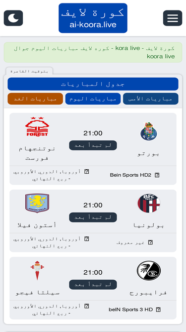 شاهد مباريات اليوم بث مباشر بجودة عالية بدون تقطيع — جدول المباريات، القنوات الناقلة، والأهداف فور نهايتها فقط على kora2day.