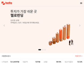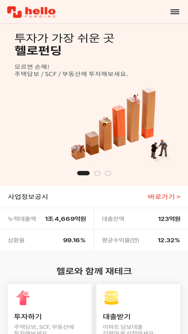 74%온라인투자연계금융플랫폼(P2P), 투자자신뢰도, 상환율 1위 헬로펀딩은 투자자에게 안정적인 수익을, 대출자에게 합리적인 대출금리를 제공합니다.