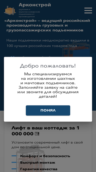 88%собственное производство, монтаж и доставка грузовых подъемников по москве и всей россии. наш завод разрабатывает подъемники на заказ нужных размеров, грузоподъемности, комплектации и отделки. вы не переплачиваете за невостребованные элементы! гарантируем выгодную цену, безупречное качество комплектующих и сборки готового оборудования.