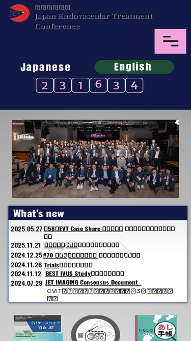 87%医療 | Japan Endovascular Treatment Conference (JET) 末梢血管治療に対する治療技術の交流と研究・開発・教育の発表の場とし、広く同技術の普及を計るための基礎的な問題を討論し、会員の技術の向上の場とすることを目的とする。
