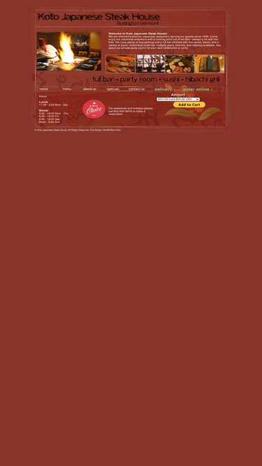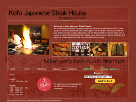 87%welcome to koto japanese steak house! we are vermont's premier japanese restaraunt. come enjoy our japanese ambience with a pond full of koi fish and running water-- always a hit with the kids. we have plenty of free parking and a bar with fine wines, beers and a variety of liquor.