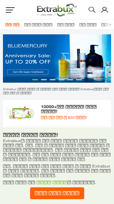 99%extrabux korea는 macy 's, ebay, walmart, farfetch 등 전 세계 유명 브랜드에서 캐시백을 제공합니다. 최신 쿠폰과 핫딜을 통해 최적의 가격을 찾고 더 많은 돈을 절약하도록 도울 수 있습니다. 지금 바로 extrabux korea와 함께 캐시백을 받으세요!