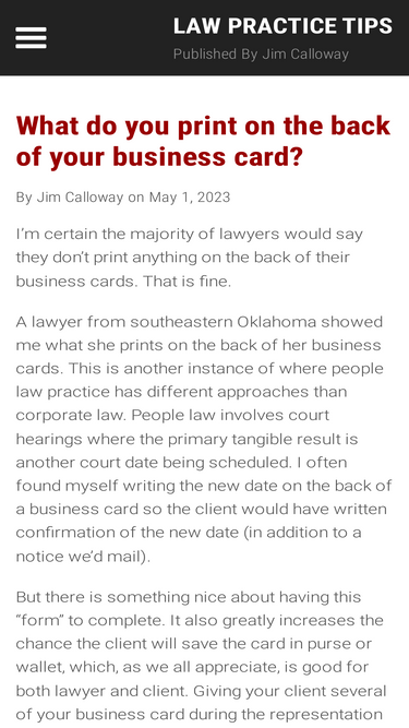 90%Law Practice Tips is a publication by Jim Calloway providing updates on legal technology issues, internet research, law office management and legal ethics.
