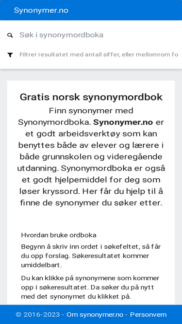 74%synonymordboka er en gratis norsk synonymordbok. Dette er godt arbeidsverktøy som kan benyttes både av elever og lærere. Her får du hjelp til å finne de synonymer du søker etter.