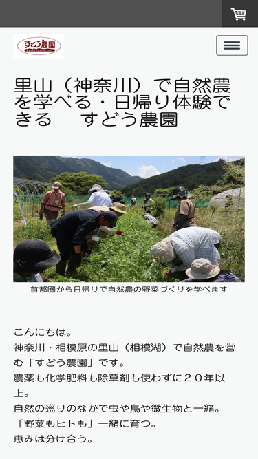 100%こんにちは。 神奈川・相模原の里山(相模湖)で自然農を営む「すどう農園」です。 農薬も化学肥料も除草剤も使わずに20年以上。 自然の巡りのなかで虫や鳥や微生物と一緒。 「野菜もヒトも」一緒に育つ。 恵みは分け合う。 首都圏から日帰りで自然農を学べる場・講座の場として 都会の皆さんと農的暮らしの架け橋をしています。 気候変動や遺伝子組み換えなど、諸々の食の危機のなか。 楽しく、美味しく、無理をしないで。 自然農をやってみませんか。 オンラインでは味わえない、五感を通じた学びです