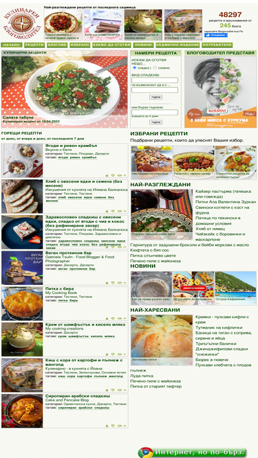 72%блоговодител е кулинарен пътеводител, обединяващ 44779 рецепти от 239 български кулинарни блога. можете да търсите кулинарни рецепти, да публикувате собствени кулинарни вълшебства и да оцените рецептите, публикувани от други любители на готвенето.