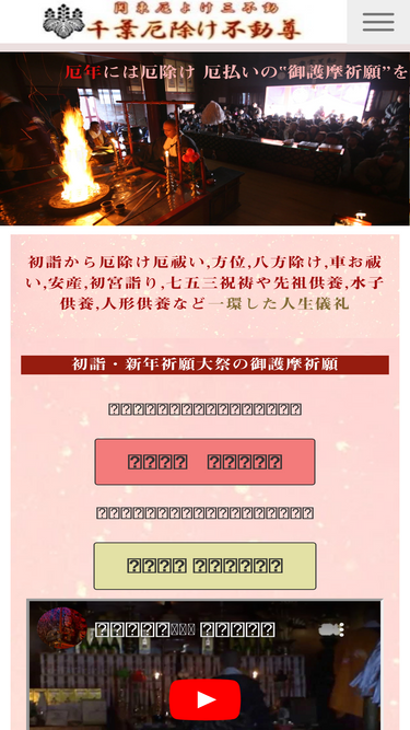 94%厄年の厄除け・厄払いは関東厄よけ三不動【千葉厄除け不動尊】妙泉寺へお越し下さい。初詣・方位除け・八方除け・車のお祓い・病気平癒等の御護摩祈願や安産・お宮参り・七五三等のお祝い祈願を毎日厳修しています。お寺境内にある愛染神社もご案内します。