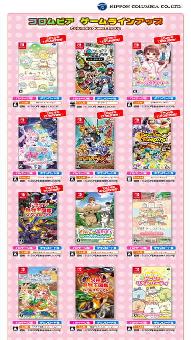95%日本コロムビアのゲームラインナップです。まめゴマ はっぴー!スイーツファーム、ほっぺちゃんでつくて!あそんで!ぷにぷにタウン、こびと3ds,モノクロブー&ベビーブー くるりんboo,lovelyようちえん日記,つなげて!パイプマニア,ステキにナースdays,クプ〜!!まめゴマ!,装星機ガジェットロボ,なかよしオールスターズ,まめゴマ2、まめゴマ、チョコ犬のスィーツデパート
