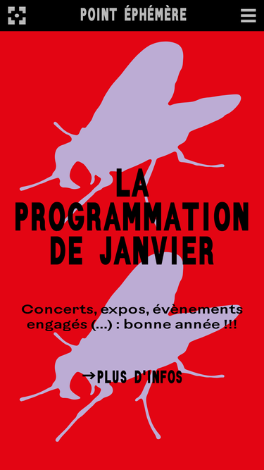 point éphémère est un lieu culturel pluridisciplinaire ouvert en 2004 par l’association usines éphémères qui investit des lieux en déshérence pour mener à bien une proposition artistique et culturelle. ouvert à tous et toutes dans leurs différences et leurs singularités, point éphémère, c’est un esprit alternatif, indépendant et festif qui fait de lui un acteur culturel important de la capitale. communication(@)pointephemere.org