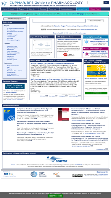 77%the iuphar/bps guide to pharmacology. an expert-driven guide to pharmacological targets with quantitative information on the prescription medicines and experimental drugs that act on them. developed as a joint initiative of the international union of basic and clinical pharmacology (iuphar) and the british pharmacological society (bps) and is now the new home of the iuphar database (iuphar-db).