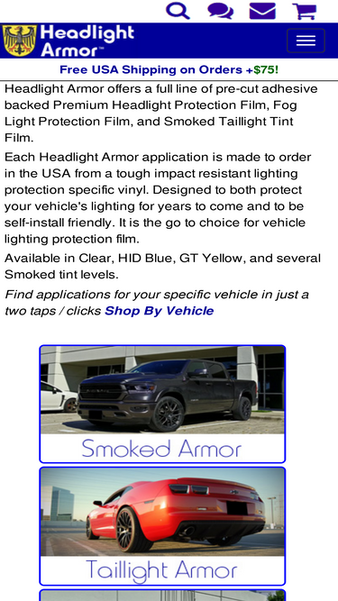 93%Headlight Armor Headlight Protection Film provide the best protection for vehicle's headlights and fog lights. Available in clear, blue, yellow + 2 tint levels - lightly smoked to blacked out. Designed for DIY friendly application! Proudly made to order in USA since 2003!