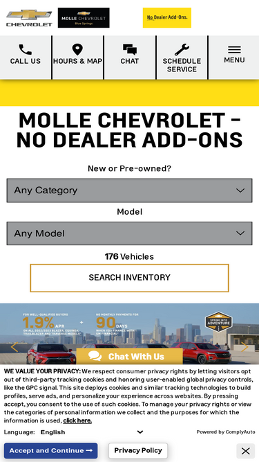 98%welcome to molle chevrolet, your preferred chevy dealer serving independence, lee's summit, & kansas city shoppers. give us a call at 866-774-2669.