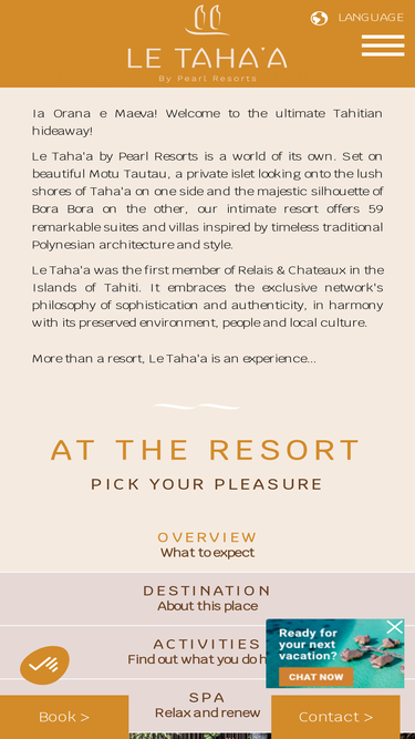 90%nestled on secluded motu tautau, facing the verdant island of taha’a on one side and stunning views of bora bora on the other side, this boutique resort inspired by polynesian architecture and style hosts 57 beautiful overwater suites and beach villas.