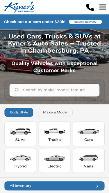94%Shop Kyner's Auto Sales selection of 232 certified and used cars, trucks and SUVs for sale in Chambersburg, PA