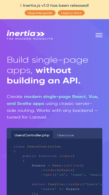 79%Inertia.js lets you quickly build modern single-page React, Vue and Svelte apps using classic server-side routing and controllers.