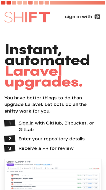 78%Put your Laravel upgrades on autopilot with a subscription to a Shifty Plan including access to Shifts, the Shift Workbench, and additional automation tools.
