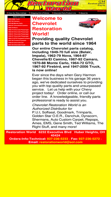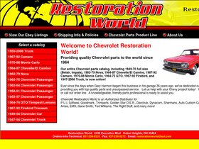66%chevrolet restoration world carries parts for all classic chevy cars and trucks including belair, impala, nova, chevelle, camaro, monte carlo, and 1947-2006 truck.