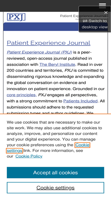 71%patient experience journal (pxj) is an international, multidisciplinary, and multi-method, open-access, peer-reviewed journal engaging research, proven practices and a range of perspectives, inclusive of patients and families, focused on understanding and improving patient experience. the journal is designed to share ideas and reinforce key concepts that impact the delivery of service, safety and quality and their influence on the experience of patients, residents and families across healthcare settings.