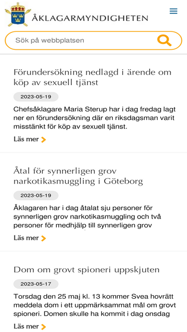 85%Välkommen till Åklagarmyndighetens startsida på webben. Här finns våra pressmeddelanden, nyheter och information om myndighetens organisation och arbete. På webbplatsen finns även information om lediga jobb i myndigheten och kontaktuppgifter till våra åklagarområden, lokala åklagarkammare samt till huvudkontoret.