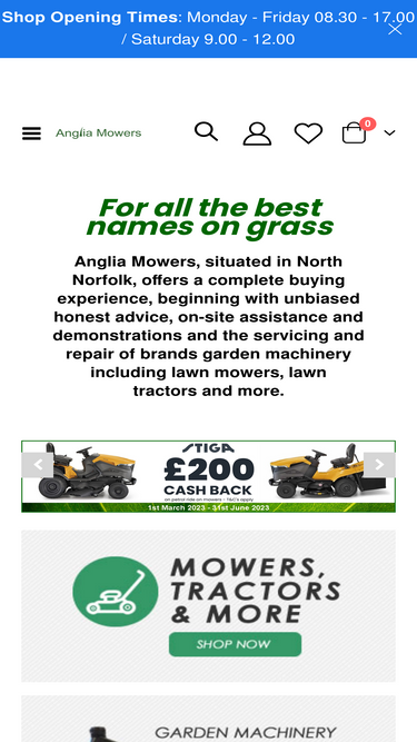 100%anglia mowers, situated in north norfolk, offers a complete buying experience, beginning with unbiased honest advice, on-site assistance and demonstrations and the servicing and repair of virtually all brands garden machinery including lawn mowers, brush cutters and more.