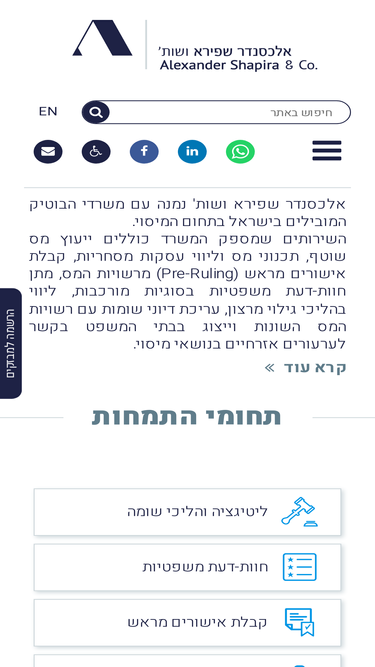 אתר האינטרנט של משרד עו"ד אלכסנדר שפירא ושות', שהינו משרד בוטיק מהמובילים בישראל בתחום המיסוי, כולל מידע רב בתחומי המיסוי השונים בהם מתמחה המשרד: מס הכנסה, מס רווחי הון, מיסוי בינלאומי, מע"מ, מיסוי מקרקעין, מיסוי שוק ההון, מיסוי תאגידים, מיסוי נאמנויות, מיסוי אופציות לעובדים ועוד.