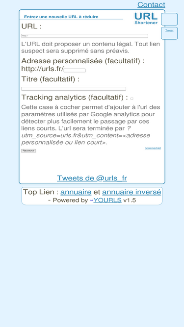 74%service gratuit de redirection d'url. cacher une url. transforme une url longue en beaucoup plus courte pour les partager plus facilement (facebook, twitter...)