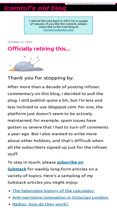 According to Similarweb data of monthly visits, lcamtuf.coredump.cx’s top competitor in January 2026 is lcamtuf.blogspot.com. lcamtuf.coredump.cx 2nd most similar site is samy.pl, and closing off the top 3 is securityfocus.com.
