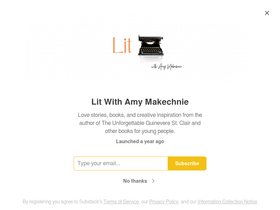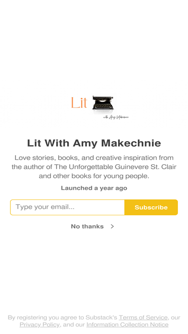 95%Good books, love stories, and creative inspiration from the author of The Unforgettable Guinevere St. Clair and other books for young people. Click to read Lit With Amy Makechnie, a Substack publication with hundreds of subscribers.