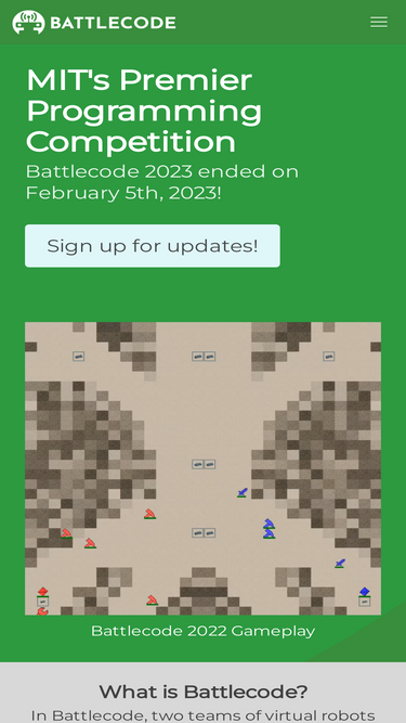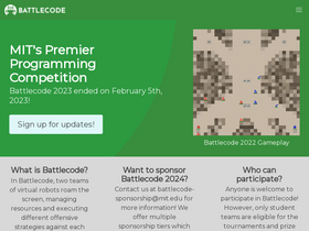 92%MIT Battlecode is a real-time strategy game for which you will write an autonomous player that will strategically manage a robot army to defeat the enemy team! As a contestant, you will learn to use pathfinding, distributed algorithms, communications, and game theory to make your player as competitive as possible. Battlecode is open to anyone. Any team is eligible to participate in the Sprint Tournaments for prize money. However, only student teams (including non-MIT student teams) are eligible for the remaining tournaments and prize money.