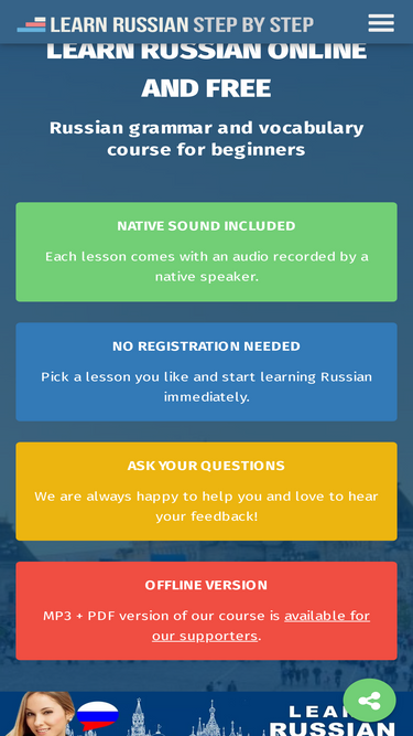 100%learn russian online with our free russian language lessons. includes russian audio, grammar, vocabulary, alphabet, verbs, pronunciation and exercises.