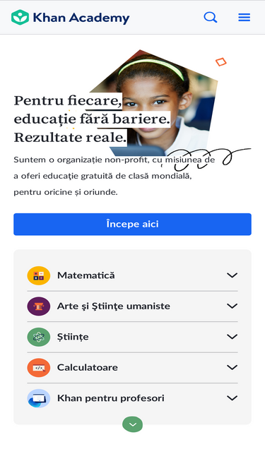 90%Învață gratuit matematică, arte, informatică, economie, fizică, chimie, biologie, medicină, finanțe, istorie și altele. Khan Academy este non-profit, având misiunea de a furniza educație gratuit, la nivel mondial, pentru oricine, de oriunde.