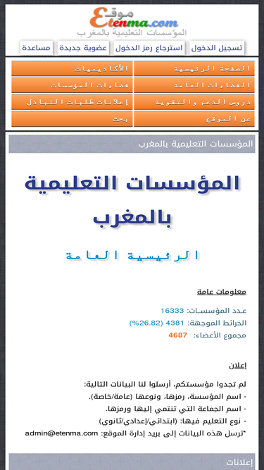 موقع المؤسسات التعليمية بالمغرب، هو موقع اجتماعي تربوي. نهدف من خلاله إلى التعريف بمختلف المؤسسات التعليمية بالمغرب وبأنشطتها التربوية وإلى انفتاحها على محيطها المحلي والوطني والعربي، والمساهمة في إيجاد فضاء موحد للتواصل وتبادل الخبرات بين مختلف الفاعلين والشركاء في الميدان التربوي...