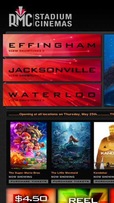 100%rmc stadium cinemas, with locations in effingham, jacksonville, and waterloo, il. with saturday morning movies, movie gift cards, and vip club movie discounts.