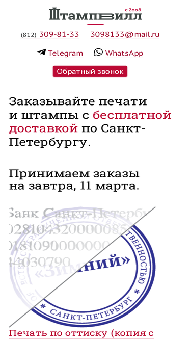 95%если вы ищете изготовление печатей и штампов в спб быстро, недорого и качественно, то попали на правильный сайт. печати от 350 руб, срочность от 15 мин. доставка по городу за 2 часа.
