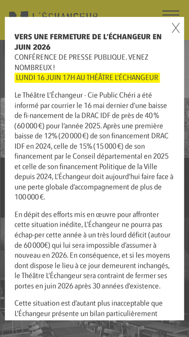 91%Depuis 1996, le théâtre L'Échangeur - Cie Public Chéri est simultanément : > lieu de résidence permanente de Public Chéri : la compagnie y fabrique et y représente ses créations professionnelles. > lieu de diffusion de spectacles pluridisciplinaires : théâtre, danse, musique… > lieu de formation, de pratique et de création amateurs : 3 ateliers théâtre et 1 atelier musique s'y déroulent chaque semaine. Le lieu s'étend sur 2000m2 dont deux salles de spectacle, deux espaces dédiés aux résidences et pratiques amateurs et deux studios de travail en mutualisation au long cours.