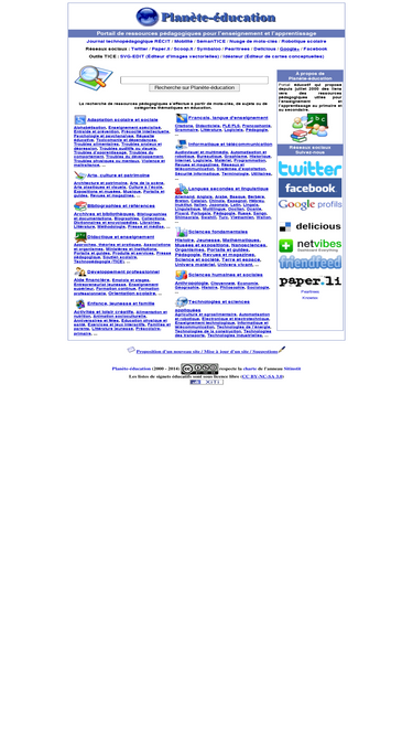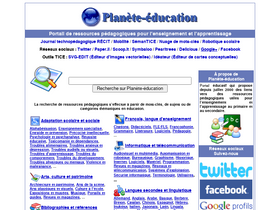 98%planète-éducation est un portail éducatif qui propose des ressources pédagogiques favorisant l'intégration des technologies de l'information et de la communication (tice) dans l'enseignement et l'apprentissage au primaire et au secondaire. il s’adresse principalement aux intervenants et spécialistes du monde scolaire francophone (canada, france, belgique, suisse, afrique, moyen-orient, antilles, océanie, amérique, europe et asie) ainsi qu’aux élèves et leurs parents. la recherche des ressources s’effectue à partir de mots-clés, de sujets ou de catégories thématiques : adaptation scolaire et sociale, arts, culture et patrimoine, bibliographies et références, didactique et enseignement, développement professionnel, enfance, jeunesse et famille, français, langue d'enseignement, informatique et télécommunication, langues secondes et linguistique, sciences fondamentales, humaines et sociales, technologies et sciences appliquées.