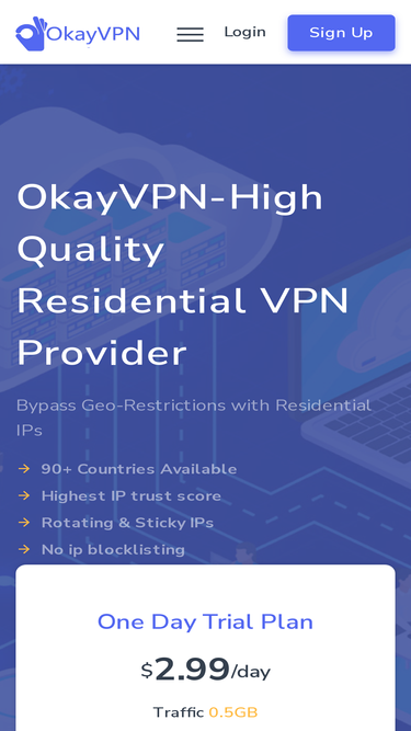 89%okayvpn,high quality residential vpn & proxy with highest ip trust score,cleanest,fresh ip pool available.working for web scraping,cpa,surveys,dating,craigslist,etc.